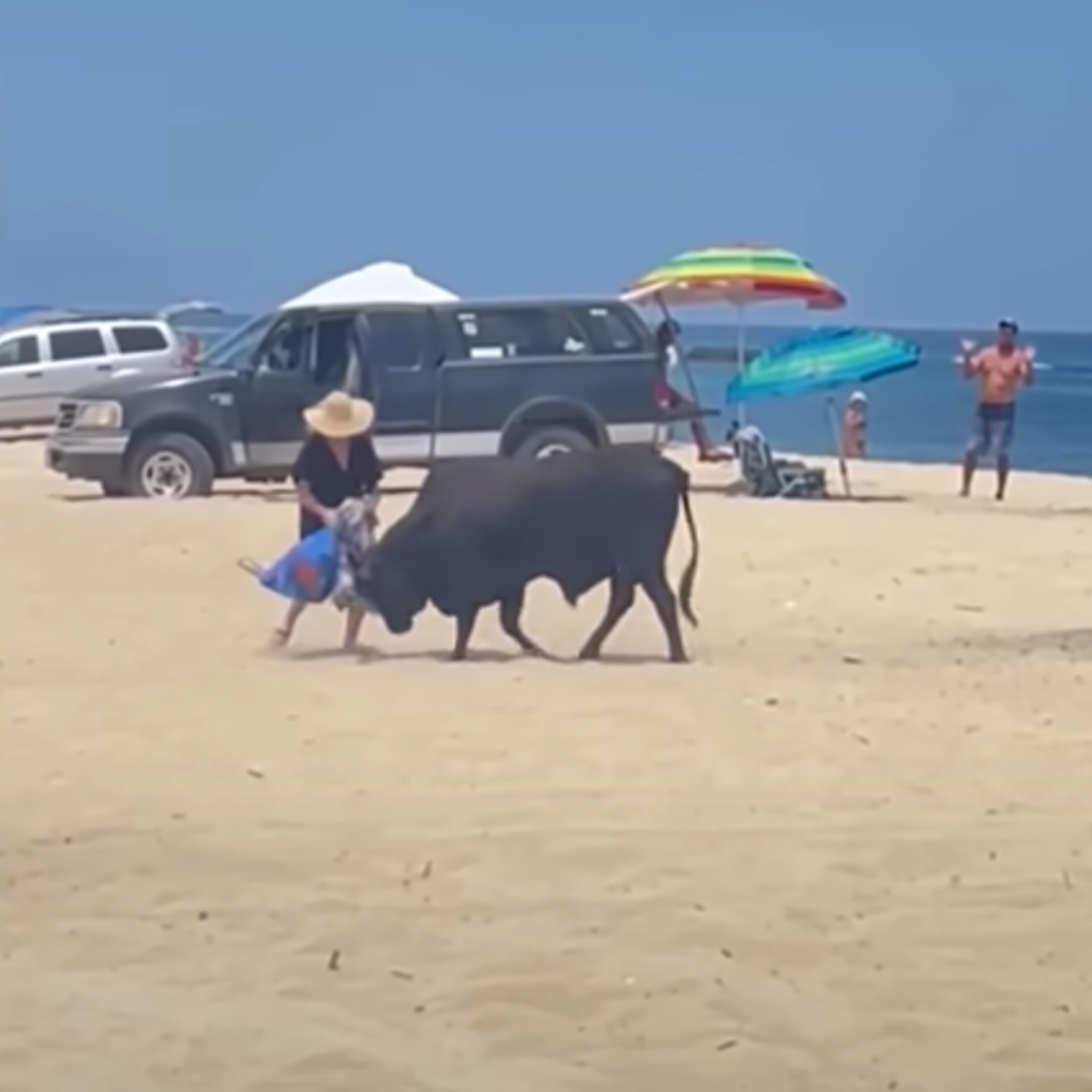 Een stier viel dit weekend een vrouw aan op een strand in de Mexicaanse staat Baja California Sur, terwijl geschrokken...