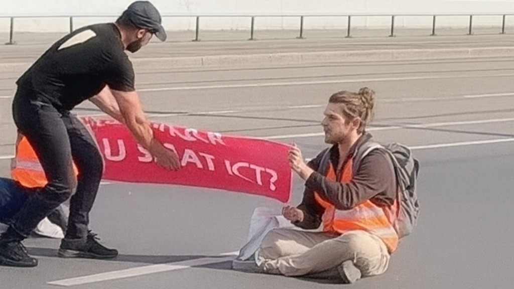 Zonder aarzeling pakt hij het spandoek uit hun handen en smijt het aan de kant. Terwijl de groep verbaasd toekijkt, pakt hij vervolgens een van de actievoerders stevig bij de arm en sleept hem van het wegdek.