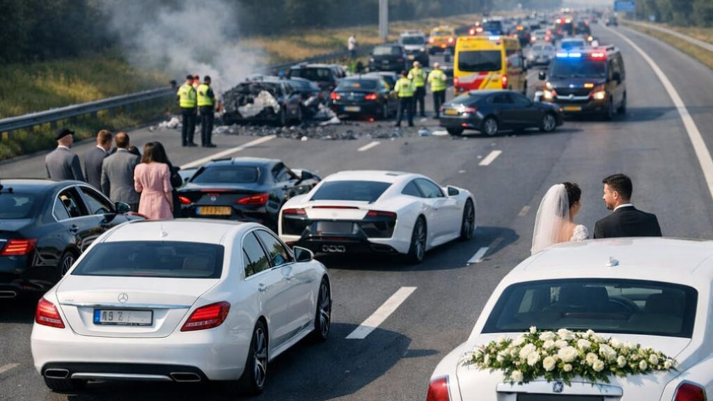 Wat een feestelijke dag moest worden, eindigde in complete verkeerschaos. Een uitbundige bruiloftstoet met meerdere gehuurde luxeauto’s raakte betrokken bij een kettingbotsing op de snelweg. Meerdere voertuigen liepen flinke schade op en de kosten zouden in de tonnen lopen.
