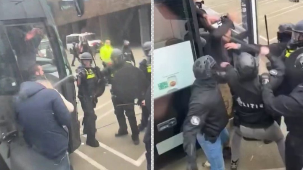 De video’s die inmiddels rondgaan op platforms zoals Facebook, X en TikTok laten zien hoe meerdere supporters pepperspray in hun gezicht krijgen. Volgens ooggetuigen werden niet alleen relschoppers geraakt, maar ook mensen die simpelweg bij de bussen stonden te wachten op vertrek.