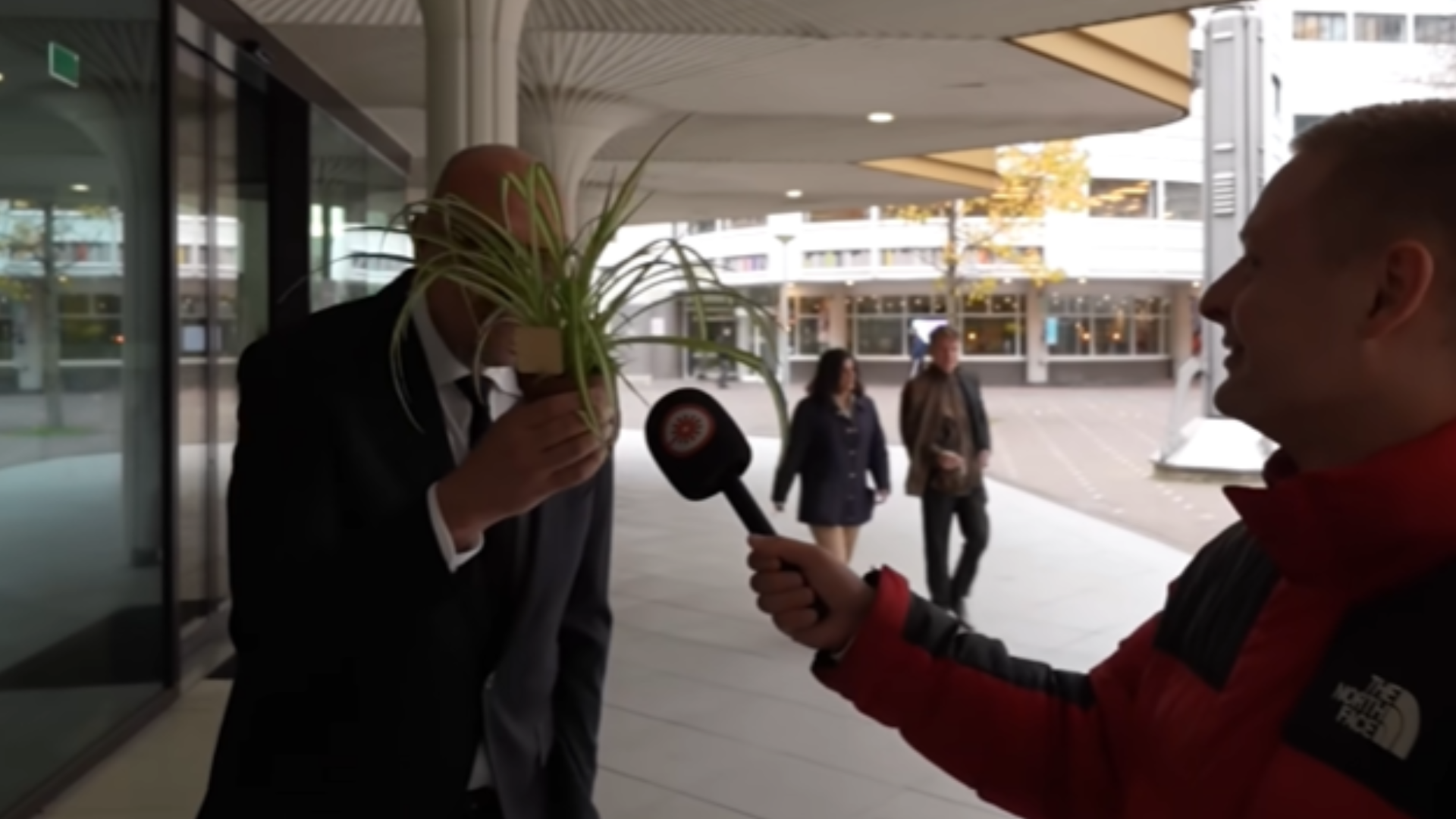 Claassen reageert in eerste instantie niet, maar verschuilt zich achter een plantenbak in de hal — een opmerkelijke keuze voor een volksvertegenwoordiger die net is beëdigd.