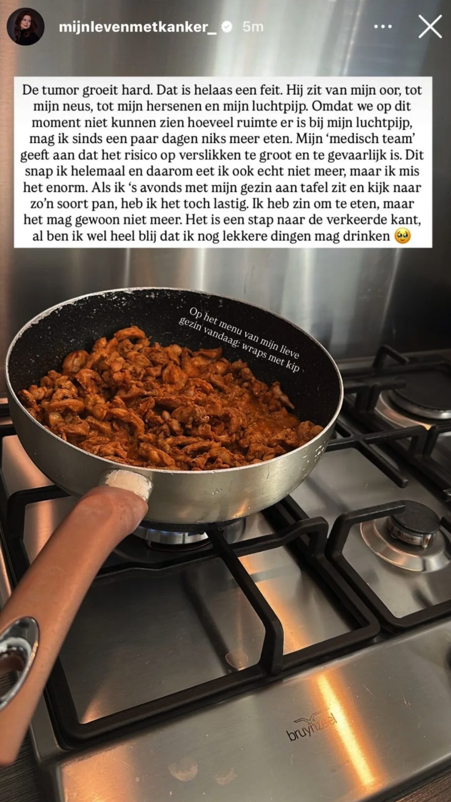 Dit heeft niets te maken met gebrek aan eetlust. Het is een medische beslissing. Door de plek en groei van de tumor is het risico op verslikken te groot geworden. In haar situatie kan dat levensgevaarlijk zijn.