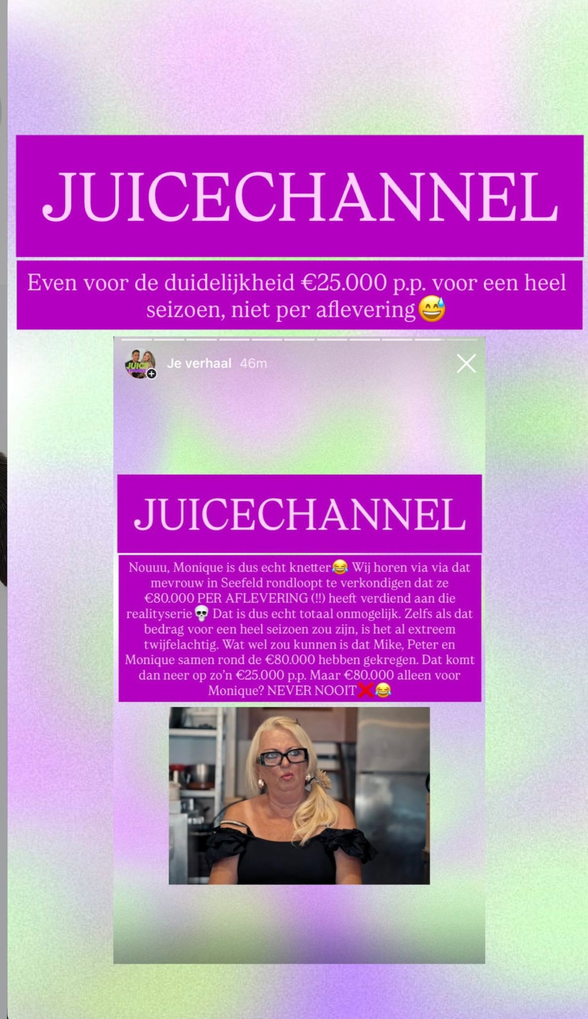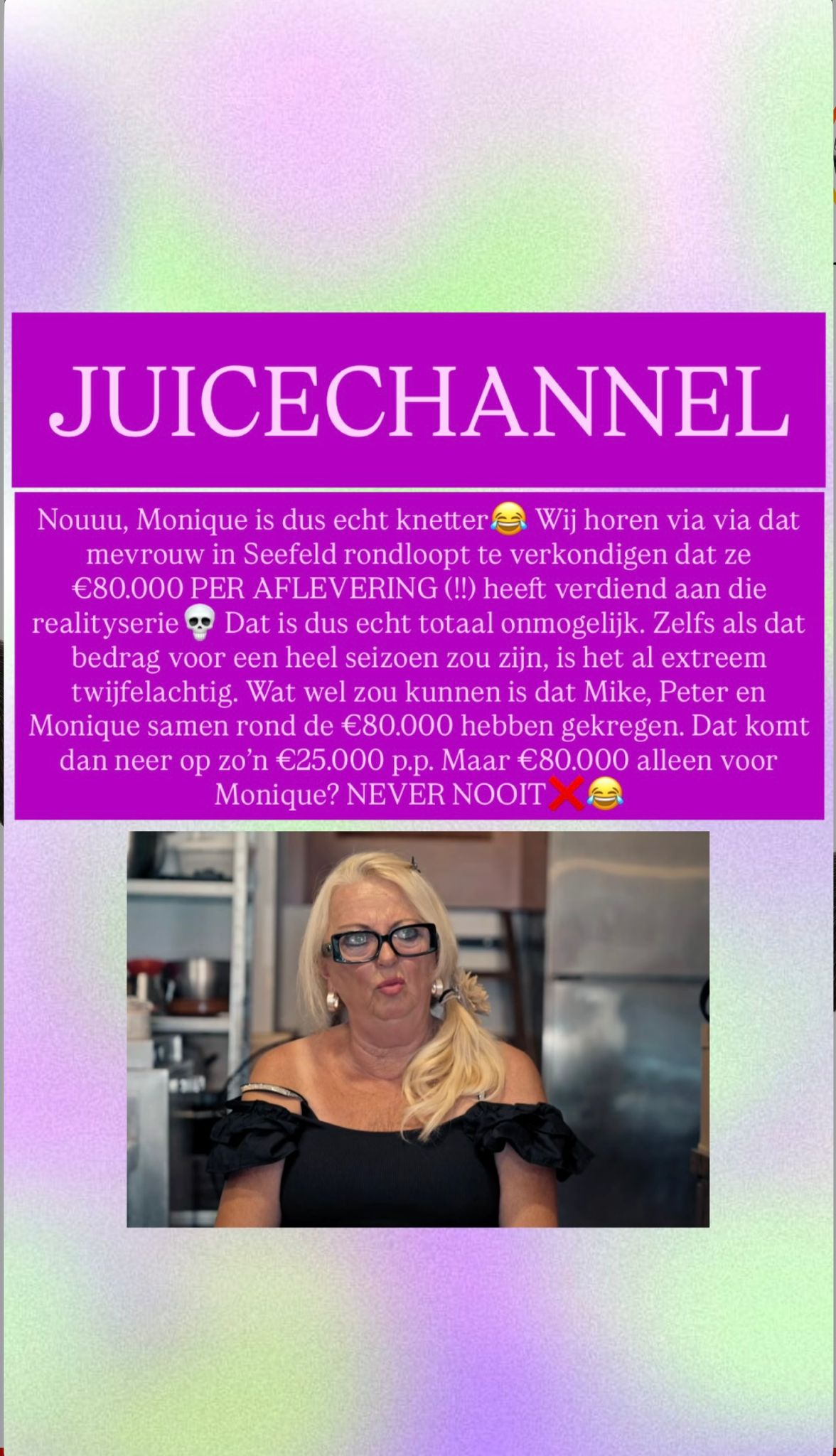Volgens berichten die rondgaan – en die door Juicechannel stevig werden tegengesproken – zou zij maar liefst 80.000 euro per aflevering hebben gekregen.