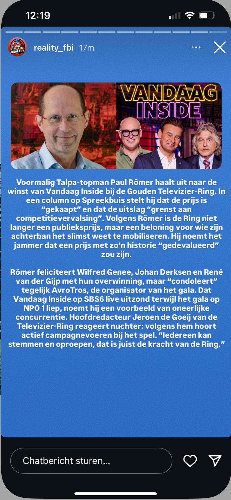 Römer spaart zijn woorden niet. Hij noemt de winst van Vandaag Inside een vorm van “competitievervalsing” en stelt dat de stemming “gekaapt” is door de achterban van het programma.