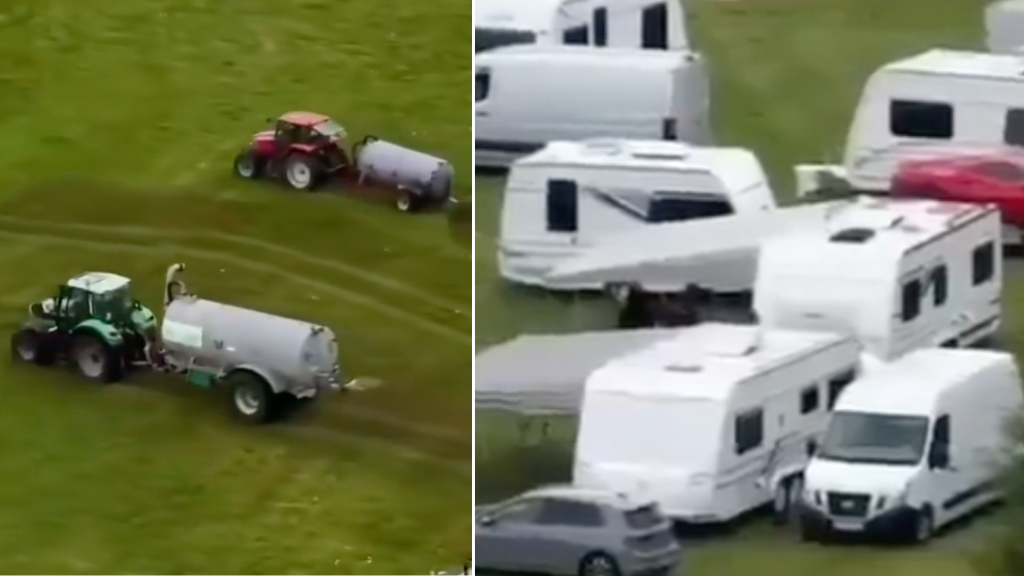 En hoe: met een goedgevulde giertank reden ze het weiland op en gaven de indringers een flinke mestdouche. Het resultaat? Caravans onder de drab, boze blikken, maar vooral: een leeg weiland.